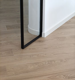 Gli spazi si presentano ariosi e armoniosi, dominati da superfici bianche, linee pulite e un uso sapiente della luce, sia naturale che artificiale. Il pavimento effetto legno chiaro unifica le diverse aree della casa, creando una base calda e accogliente che contrasta con la sobrietà del bianco dominante.